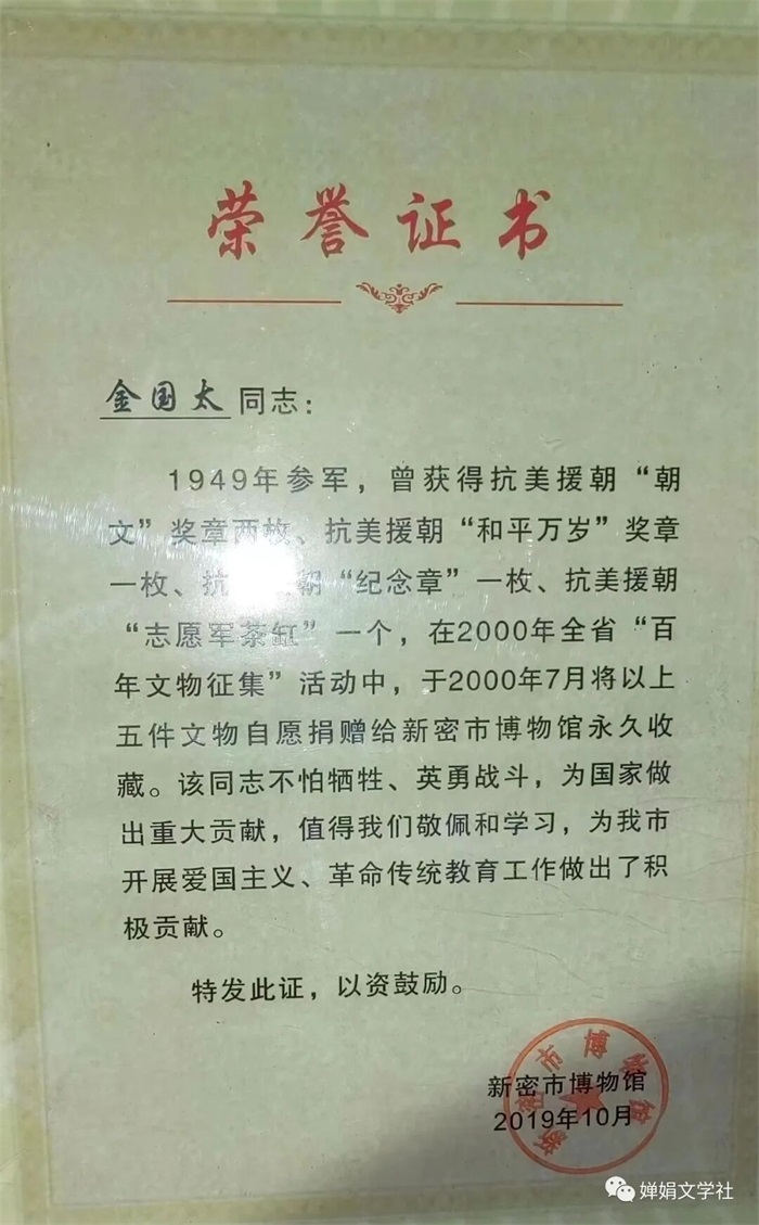 他,就是新密市尖山风景区管理委员会下寺沟村金家门组,101岁抗美援朝老英雄金国太。