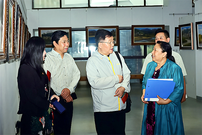 中共河南省委宣传部原副部长刘富民即席讲话,为郭华赠送墨宝“江山如画”,表达对伟大祖国的美好祝愿,对郭华画展的衷心祝贺。