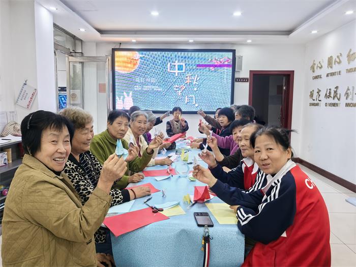 在社区指尖星光坊内,一场“兔子望月折纸”手工体验正在上演。 在志愿者老师的指导下,大家纷纷动手,紧跟老师步骤,不一会儿便将平凡彩纸幻化成望月的玉兔。周阿姨拿着手里的“小胖兔”说道:“我的兔子养的最好!比你们的都肉乎。”戴阿姨举起手中的作品,得意地讲:“虽然刚开始折月亮时,我因为跟不上队伍迷路了,但现在我的月亮是最圆的!”