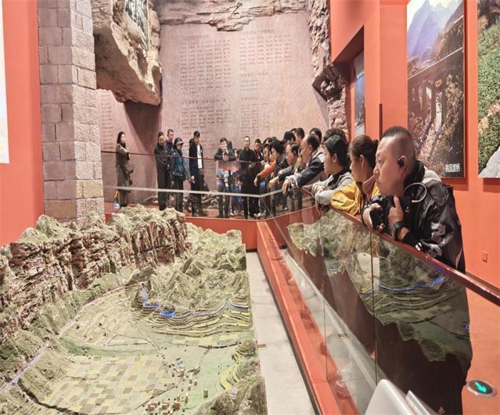 同志们在红旗渠纪念馆一边认真聆听讲解员生动讲解当时林县人民为了改变恶劣生存环境,在悬崖峭壁上开凿天渠的动人故事,一边观看他们创造使用的各种工具,真是应验了毛主席说的“只要有了人,什么人间奇迹都可以创造出来”的至理名言。
