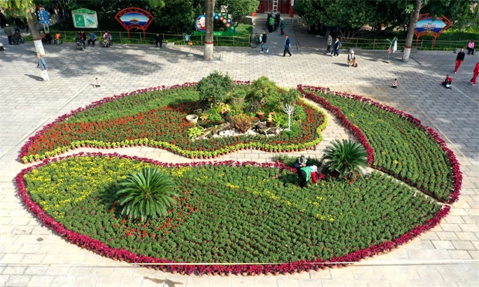 今年的安阳国庆主题花坛风格迥异,寓意深刻。人民公园西门外广场的“童趣飞扬”立体花坛,以甲骨文形态的图案,结合传统“福”字,呼应安阳“甲骨故里”身份,融合安阳城市风貌与生态环境,营造和谐氛围,寓意城市在历史传承中蓬勃发展,生态与人文共荣;洹水公园东门外广场的“美丽安阳”立体花坛,以安阳标志性的青年洞、红旗渠为核心载体,融合亚长牛尊、妇好鸮尊独特文化符号,借山水形态串联元素,展现地域历史底蕴与人文魅力;易园西门外广场的“花好月圆”立体花坛,用特色建筑造型,展现地域文化底蕴,借花卉色彩与国庆主题词,传递对祖国的祝福与对美好生活的赞颂;市党政综合楼南门外广场的“祝福祖国”立体花坛,融合国旗元素、时间印记与传统吉祥符号,展现国家发展历程,彰显爱国情怀与对祖国繁荣的期盼。而市民文化广场“吉祥如意”立体花坛,迎宾公园南园西南广场“花开盛世”立体花坛、三角湖公园南门“‘盆’然心动·‘景’彩国庆”立体花坛也各有千秋,竞相争艳,为城市增添了浓厚的节日气息,为市民和游客增加了休闲娱乐的好去处。