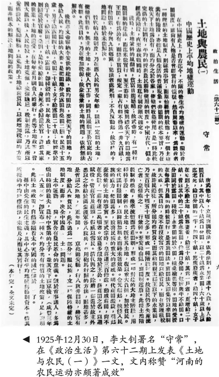 1925年,为给苦难中的农民探寻出路,李大钊深入郑县(现郑州二七区)、荥阳、密县进行调研。他听闻了天灾时地主守粮、农民被逼抢粮的绝境,目睹了佃农“春种秋收半袋粮”的窘迫,感触到了百姓“苛捐压肩、无米下锅”的饥寒。地处三县交界的密县刘堂,不仅是他汇总农情的核心据点,更是中共密县第一个党小组的诞生地。这些深刻心底的苦难,让他看清了“农民不解放,中国难复兴”的真相,最终凝结成了12月30日发表的《土地与农民》。文中,他首次以马克思主义思想划分农民阶层,倡导“耕地农有”,为中国革命指明了“扎根农村、依靠农民”的破局方向。