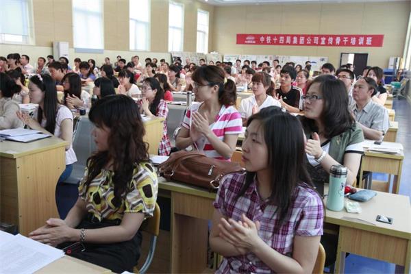中铁十四局的宣传骨干正聚精会神地听李佩山讲《生命的火焰》采写发表始末。 杨德政 摄