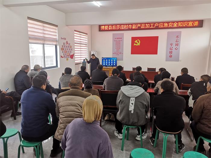 后莎庄村是博爱县牛副产品主要加工村,全村有50多户从事牛副产品加工,从业人员500多人,带动周边村800多人从事该行业经营。由于生产工艺需要,加工户需要使用氧气、液化石油气、天然气,县应急局在前期的走访中了解到大多数加工户及从业人员对氧气、液化石油气、天然气安全知识欠缺,使用过程中存在安全风险,局党委决定到该村开展一场有针对性的应急安全知识进农村宣讲活动。