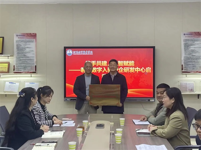 仪式结束后,双方领导共同为研发中心揭牌,并参观了联合研发空间。张艺博院长表示,智能财经学院将匹配最优质的师资、学生与算力资源,全力支持研发中心的建设与运营。徐延军也承诺,君友数字将投入核心技术与数据资源,共同将中心打造为可复制、可推广的产教融合新范式,成为全省乃至全国校企合作的“经贸样板”。