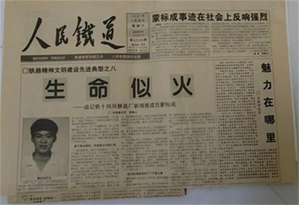 1997年1月25日,《人民铁道》报以铁路精神文明建设先进典型之八,在一版头条转三版图文并茂的刊登长篇讯《生命似火》(——追记铁十四局修造厂新闻通讯员蒙标成),并在报眼刊登消息《蒙标成事迹在社会上反响强烈》,还配发了《魅力在哪里?》的本报评论员文章: