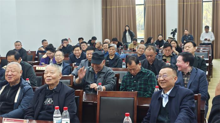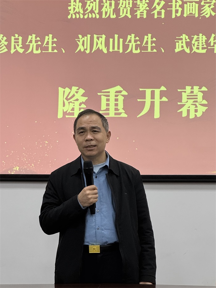 著名书画家杨修良代表三位书画家发言。杨修良先生还为学校赠送了他精心创作的一幅丈二的山水画。