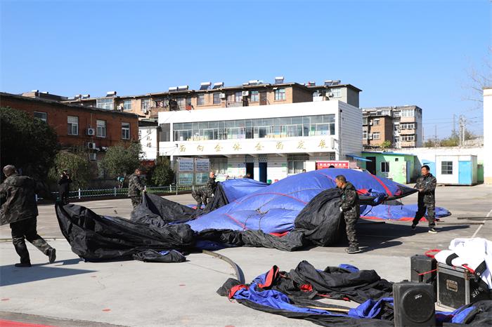 宝丰县电影发行放映公司工作人员在搭建放映棚