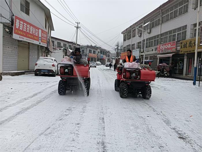 精准施策,筑牢防线。针对坡道、弯道、桥梁等易结冰、事故多发路段,采取“人工铲雪+融雪剂抛洒”相结合的方式高效除冰。同步增设安全警示标志、摆放锥桶引导交通,通过村级微信群、大喇叭实时发布天气预警、路况信息及安全出行提示,全方位防范道路安全风险。