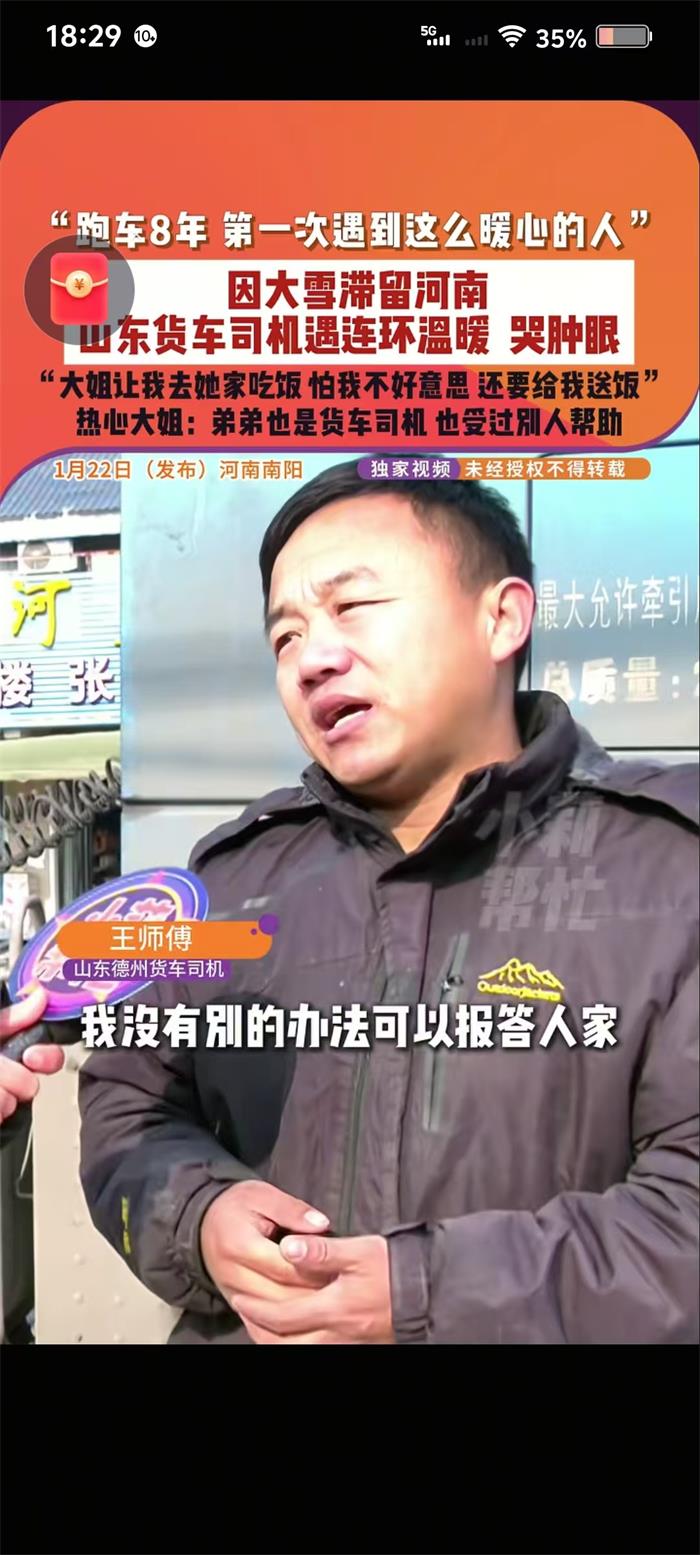 网友们纷纷留言点赞:“我是一名山东货车司机,走过南,闯过北,最喜欢的就是河南人”“河南最实在的就是南阳人”“在河南要是让你饿着了,那是我们的责任”“隔着屏幕都让我感动到了,河南人中”“我也是跑河南十来年了,河南人,中”。一句句“中”,是对河南人淳朴善良的最高赞誉,也让这场跨越鲁豫两地的暖心互动,成为这个寒冬里最动人的风景。