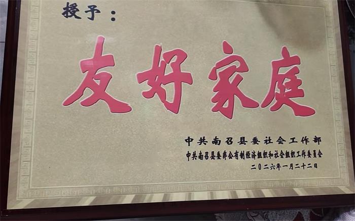 22日,中共南召县委社会工作部授予王丽君家庭“友好家庭”荣誉称号。
