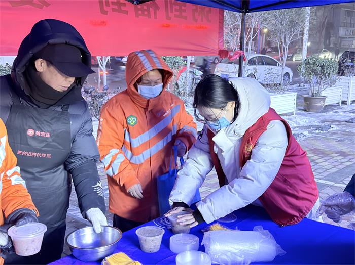为让这份关怀覆盖更多群体,聂寨社区以党建为引领,精准对接居民需求,将传统节日作为凝聚人心的抓手,精心组建志愿者小分队,带着打包好的热粥,逐一走访慰问辖区坚守岗位的外卖小哥、环卫工人等新就业群体,以及困难群众手中。“天这么冷,喝上一碗热粥太暖心了,社区还惦记着我们,感觉特别踏实。”收到粥品的环卫工人王师傅感慨道。一句朴实的话语,道出了活动传递的民生温度,商户的热心助力与社区的贴心服务,尽显对特殊群体的关怀与关照,让基层治理的“最后一公里”真正通到居民心坎上。
