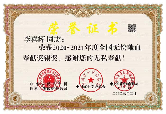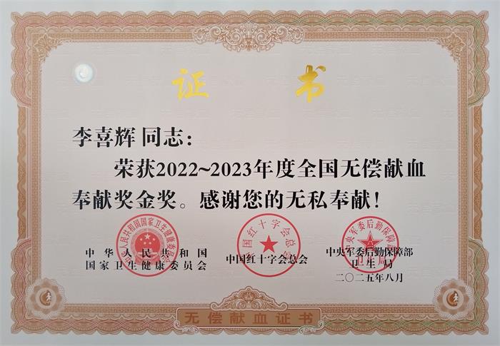 全国无偿献血奉献奖的铜奖、银奖、金奖,是国家对献血者善行的最高褒奖,也是对李喜辉二十余年默默奉献的最佳认可。但他始终将荣誉深藏于心,不图虚名、不谋回报,以最朴实的行动、最执着的坚守,诠释了新时代职工的社会担当与公益情怀,也成为该单位善行风尚的生动缩影。