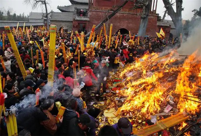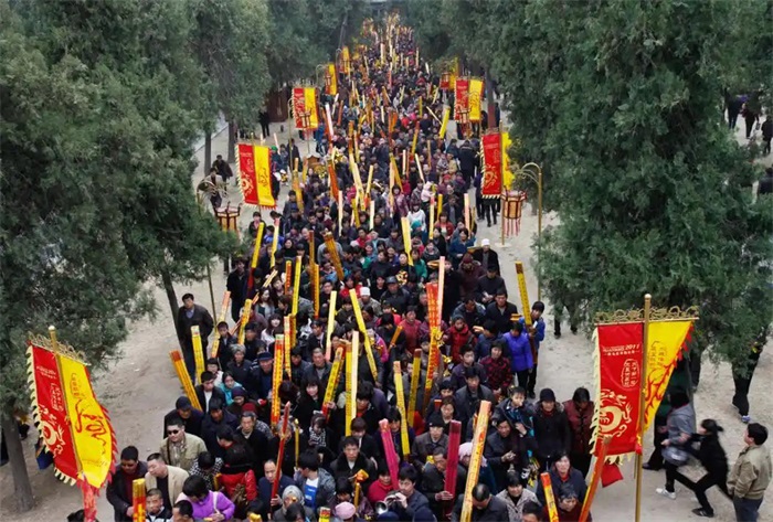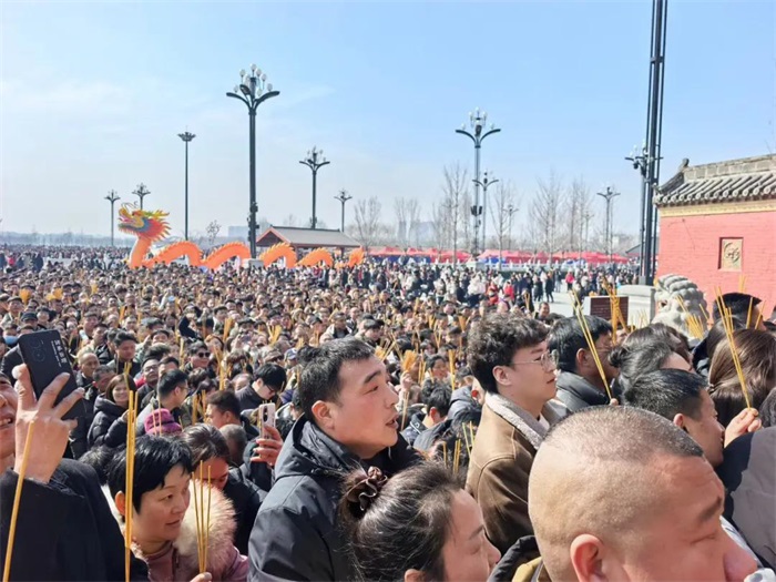 仲春二月,冰雪消融,万物复苏,龙抬头之日,庙会正式启幕。豫、鲁、皖、冀、苏等周边省份的百姓,扶老携幼,跋山涉水,涌向太昊陵。香客们身着盛装,手持香烛,肩挑供品,一路风尘,只为拜谒人祖爷,祈求平安吉祥。陵庙之内,香烟缭绕,钟鼓齐鸣,人声鼎沸,摩肩接踵,红绸带挂满枝头,祈福牌连成一片,成为红色的海洋,烟火之气直冲云霄。