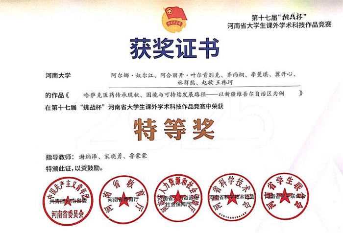 思政素养的“软实力”,正在转化为创新实践的“硬成果”。近三年,团队教师指导学生获国家级、省级专业竞赛奖项20余项。2025年,药学专业本科生阿尔娜·努尔江团队完成作品《哈萨克医药学的传承现状、困境与可持续发展路径——以新疆维吾尔自治区为例》,荣获第十七届河南省“挑战杯”大学生课外学术科技作品竞赛特等奖。 这支由汉族、哈萨克族、回族学生组成的跨民族团队,在课程团队指导下,将课程中“药品全生命周期”的叙事逻辑迁移至民族医药调研,用脚步丈量新疆6个县市,完成了一份兼具学术厚度与家国情怀的青年答卷。