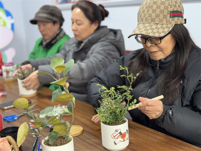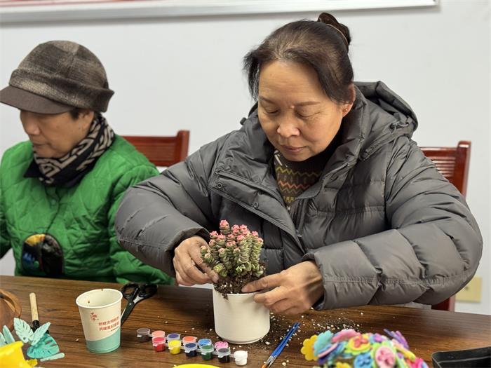 彩绘之后便是栽种。大家小心翼翼培土、栽苗、浇水,从多肉绿植到虎刺梅、长寿花,每一株花草都被精心呵护。交流间,“养花搭子”悄然结成,换花养、教技巧、话家常,陌生的邻里在一来一往中渐渐熟络,隔阂消融,温情渐生。