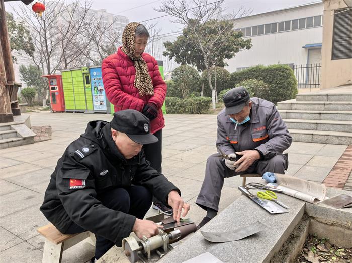 另一边,久义物业的志愿者们摆开磨刀磨剪的工具。砂轮转动,刀剪嚯嚯,清脆的打磨声成为春日里最朴实的旋律。居民们带着家中钝锈的刀具、剪刀前来,志愿者们俯身打磨,磨去锈迹,磨出锋芒。一把把锃亮的工具交还居民手中,不仅解决了生活里的小难题,更拉近了邻里间的距离。