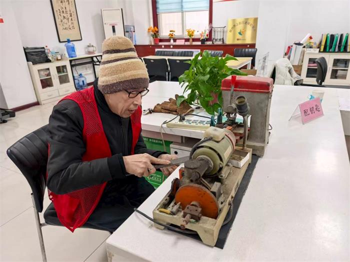 在便民服务区,“配钥匙”和“磨刀”摊位前人潮涌动,备受居民青睐。经验丰富的志愿者师傅们用专业工具为居民打磨菜刀、剪刀,让旧刀具焕然一新;同时细心配制钥匙,解决了居民日常生活中的小难题。社区还组织了义剪服务,志愿者们以娴熟的技艺和热情的态度,为居民提供了全方位的便利。