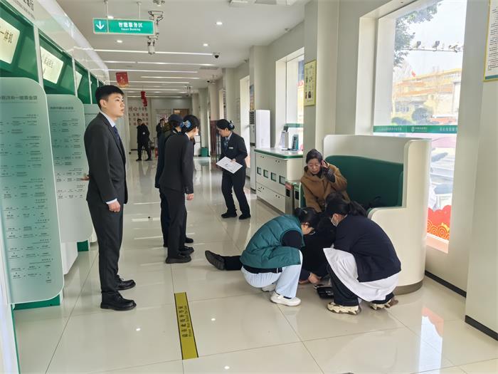 当日上午11时左右,网点内一如往常地忙碌而有序。一位姓李的60多岁男性客户在家属的陪同下,来到网点办理重置密码业务。就在业务办理时,该客户突然面色苍白伴随抽搐,全身大汗淋漓,不能言语,四肢无力,晕倒在地。危急时刻,大堂经理马一飞第一时间扶住了客户,并立即呼叫内勤行长。内勤行长王榆喆闻讯后火速赶到现场,凭借职业敏感性,她迅速俯身查看客户状况。此时,客户已经失去意识,情况十分危急。