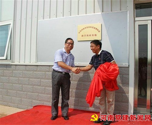 河南省委党校党建教研部郭献功主任与伊滨区庞村镇党委书记熊红万共同为教学科研基地揭牌