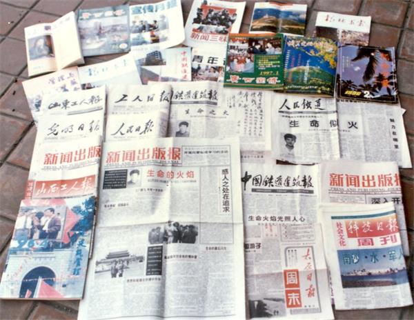 作者李佩山向通讯员介绍《新闻出版报》图文并茂刊登的长篇通讯《生命的火焰》。 杨德政 摄