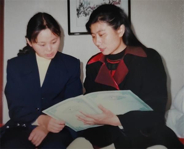 济南市中国平安保险公司女工赵玉琴(右),把为蒙标成女儿蒙晓丹投的3万元平安康乐终身保险书交给安银花