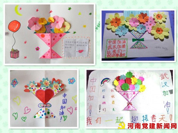 她的第一节美术课,以《众志成城·抗击疫情》为主题,引导孩子们在纸上画下了他们心中的抗“疫”英雄,用画笔表达自己在疫情中的所见所感,为武汉加油!为中国加油!她设计了《金鼠报春》一课,让孩子们在这个不平凡的春节,把太多太多想说的话用可爱的小老鼠把美好的祝愿进行表达;为了使学生在疫情期间缓解紧张的情绪,她穿插《祝福贺卡》手工制作课,让孩子们用自己灵活的小手,制作出一张张美丽的贺卡,为奋斗在一线的工作人员送去祝福;她还精心设计了《台灯》一课,为的是让学生感受到在外面严峻的疫情形式下,家是我们安全的港湾,保护好我们自己,安心待在家中,在温暖的灯光下,认真学习,等待春暖花开,等待疫情散去,好早日回到学校。