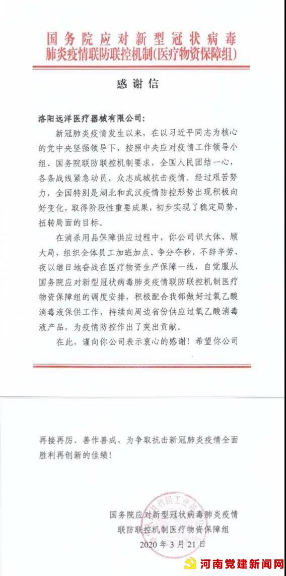 日前,国务院应对新冠肺炎疫情联防联控机制(医疗物资保障组)发出感谢信,对位于偃师翟镇的洛阳远洋医疗器械有限公司在疫情期间做出的突出贡献表示诚挚的谢意。同时,勉励洛阳远洋医疗器械有限公司再接再厉、善作善成,为争取抗击新冠肺炎疫情全面胜利再创新的佳绩。