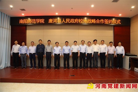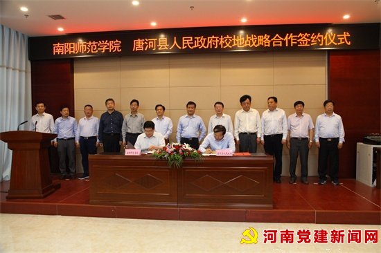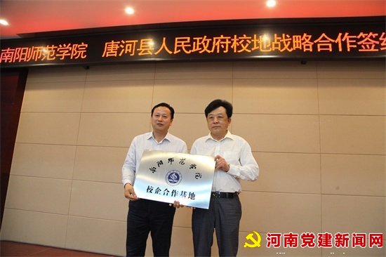 仪式上,南阳师范学院校长卢志文和唐河县人民政府县长周天龙共同签署了《校地战略合作协议》。