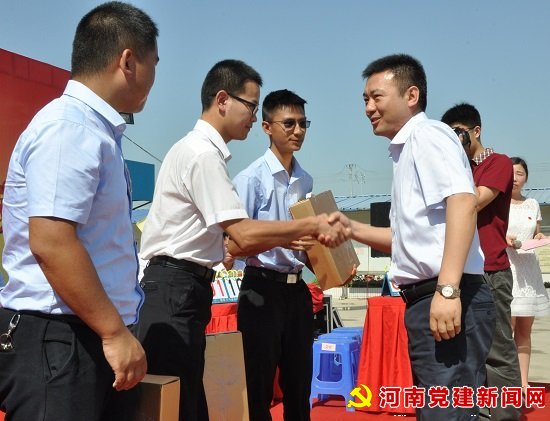 中建七局安装公司党委副书记、纪委书记李兴胜为荣获冠军的电安装事业部代表对颁奖