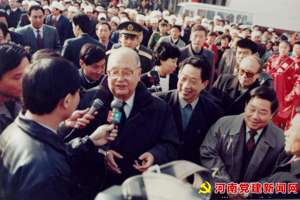 1992年12月12日上午,全国政协副主席王光英(左二),在项城参加河南莲花味精集团六万吨工程项目竣工暨莲花味之素开工庆典现场,接受中央电视台记者采访。 (尹程起 摄影报道)