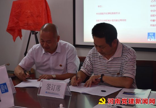 荥阳市纪委副书记朱宏伟(右)和中建七局华北公司党委副书记、纪委书记兼工会主席陶征淮(左)签订《政企联创共建廉洁文化示范点协议书》