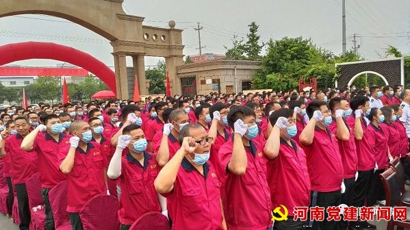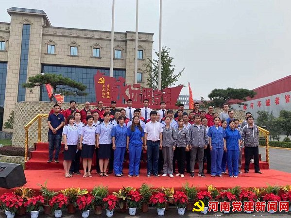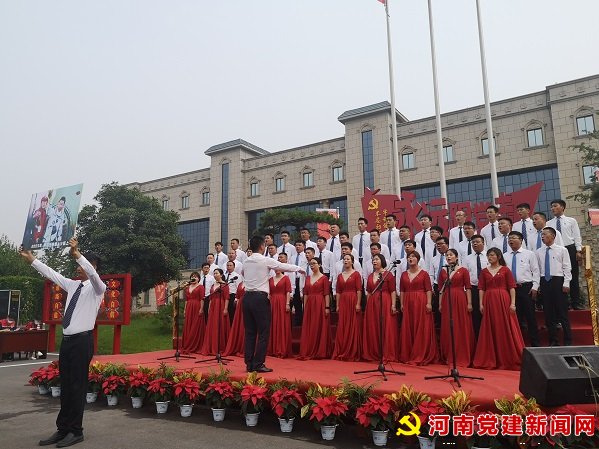 7月1日上午,在偃师市华泰建材有限公司的广场上,迎着鲜艳的党旗,一批来自华泰建材公司党支部、建龙微纳公司党支部、偃师税务局第二分局党支部以及商城街道部分村(社区)党支部的党员正用嘹亮的歌声歌唱《没有共产党就没有新中国》。这是偃师市正在举办的“迎七一”庆建党99周年非公党建联建活动之一。