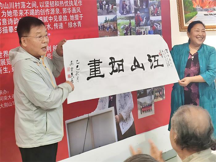 中共河南省委宣传部原副部长刘富民即席讲话,为郭华赠送墨宝“江山如画”,表达对伟大祖国的美好祝愿,对郭华画展的衷心祝贺。