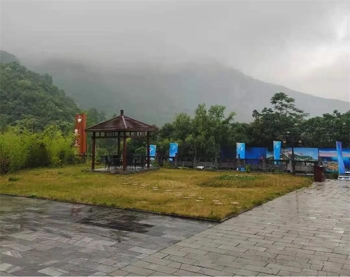 一路之上,曾听一位友人说,五朵山有歪五朵之说。明朝孝文皇帝朱允文靖难失败后在五朵山隐居修行,专注虔诚,炎炎夏日还在烈日下修行,以致于马蜂在他下巴处垒了一个窝,玉皇大帝实在心疼,就让五朵山有一个朵歪了,以便有个阴凉让他避暑。进入山门之后,经过几座庙宇,辗转来到闵公祠处。此处塑有原中国道教协会第六届理事会会长闵智亭的雕像,以纪念他为中国道教做出的杰出贡献。只见他目视南方,炯炯有神。基座之上八卦图清晰可见,我们在此处四下眺望一下,但见四周沟壑纵横,村庄坐落其间,炊烟袅袅升起,林木青翠欲滴,山间云蒸霞蔚,云层雾气腾腾,不一会儿雨哗哗地下了起来,我们马上避雨。又走一会,来到缆车处,购票之后,我们在此等候坐缆车,每人分发一个雨衣。据服务人员介绍,此缆车索道为2002年建成,游人坐上之后大大节省时间,十分钟左右即可到达山根,如果步行一趟,需要两个半小时,费时费力。