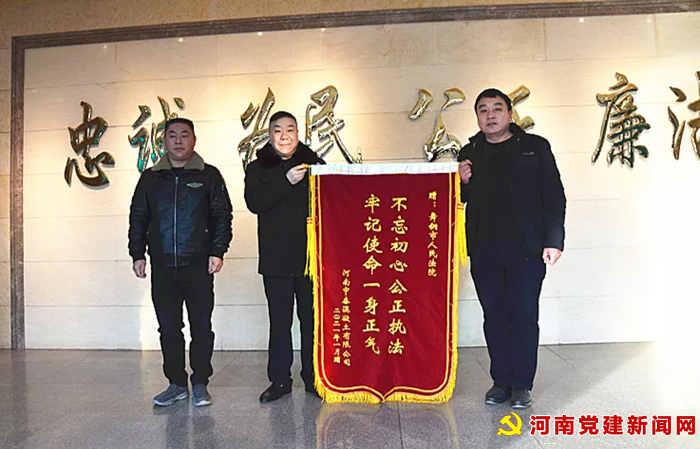河南党建网讯(李万全 通讯员:刘广申 张宁波)1月7日,舞钢市人民法院院内,丝丝寒风中洋溢出阵阵暖意。该市民营企业河南中泰混凝土有限公司总经理吴松波,亲自送来一面“不忘初心公正执法,牢记使命一身正气”的锦旗,以感谢舞钢市人民法院为维护民营企业合法权益、助力企业发展做出的努力。该院党组副书记、副院长操玉江代表舞钢市人民法院受领了锦旗。