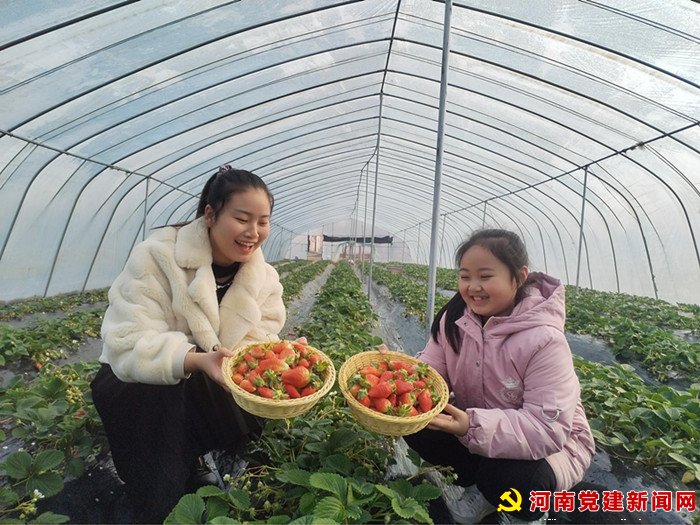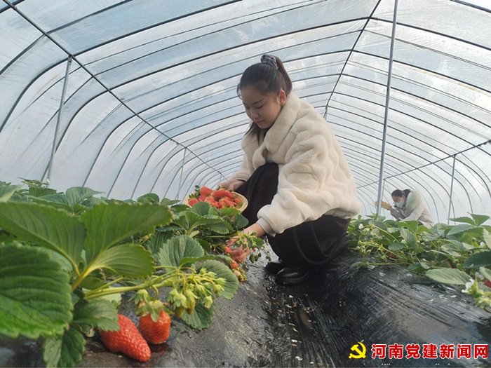 河南党建网讯(李万全 通讯员 柳真真 朱盈盈)1月8日,在宝丰县闹店镇西牛村的草莓采摘园里,温暖湿润的空气中馥郁的草莓香味扑面而来,一垄垄翠枝绿叶的草莓秧上开满了白色小花,红彤彤的草莓点缀其间,十分诱人。