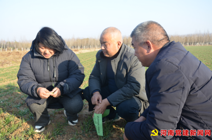 河南党建网讯:1月8日,在宝丰县闹店镇后李村的小麦田里,农技专家深入田间地头查看小麦越冬情况,解答种植户遇到的小麦生长问题,指导督促农户根据不同的墒情、苗情进行分类管理,多角度、多方面为小麦冬管“把脉”,保障小麦安全越冬。