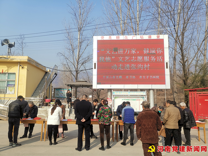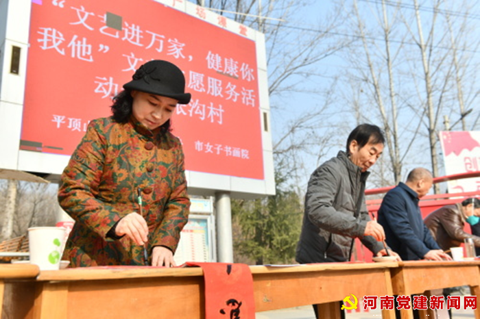 河南党建网讯(李万全通讯员:许东辉)1月9日,在驻村工作队和村两委的邀请下,平顶山市文联、书协、女子书画院联合到鲁山张沟村举办“文艺进万家,健康你我他”文艺志愿服务活动,为村民现场书写春联。