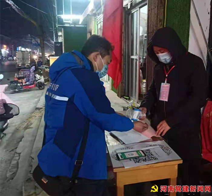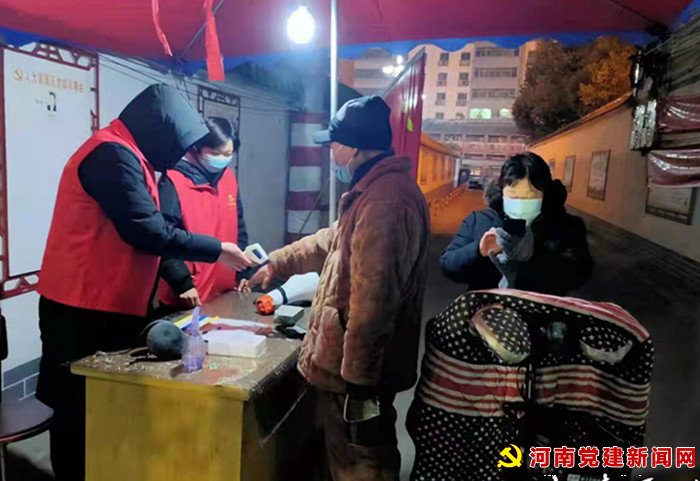 河南党建网讯(李万全通讯员夏鲁丹)“阿姨您好,请出示健康码和行程码,还需要配合测量一下体温……”1月17日晚,在宝丰县城关镇翠竹苑小区门口,“红马甲”在寒夜里坚守职责,正在认真查看进出人员“两码”、测温,值班帐篷内闪烁的一缕微光显得格外醒目。