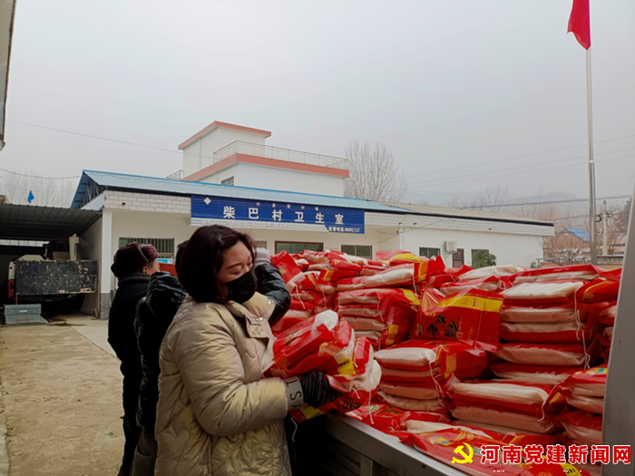 河南党建网讯(李万全通讯员王蕊) 1月20日,河南省平顶山市叶县常村镇柴巴村部大院里笑声朗朗,村民们推着小车或开着三轮前来领取春节慰问的大米。