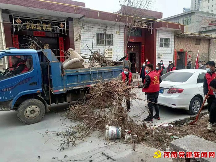 “年罢上班头一天,党员干部走在前。带领群众治六乱,清理垃圾和瓦砖。乡村振兴已起航,社区旧貌换新颜!”城关街道野狐岭社区老党员张国灿用打油诗对党员点赞。