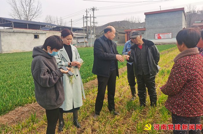 河南党建网讯(李万全李艳辉)3月2日下午,在鲁山县观音寺乡孤山村的麦田里,广大村民迎来了一批尊贵的“专家”,他们深入田间地头,拔出发黄的麦苗,仔细分析,现场指出存在的问题及喷施农药的剂量。