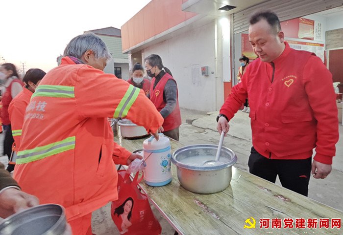 当天早上6点,宝丰县新联会副会长宋国平、韩红艳,县新联会理事、丰睿商贸有限公司总经理张国杰一行身穿志愿服,在爱心粥店操作台前,为环卫工人现场奉粥,受到了在前来就餐的环卫工人的广泛好评。