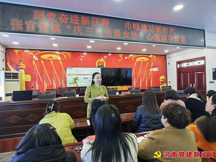 河南党建网讯(李万全 孔令阳)人间最美三月天,巾帼风采傲苍穹。为纪念“三八”国际妇女节114周年,提高全镇广大女性心理健康水平,3月7日,鲁山县张官营镇特别邀请了国家二级心理咨询师叶辉辉老师,为全镇45个村妇联主席和机关全体女同志们讲授缓解情绪和压力的知识。