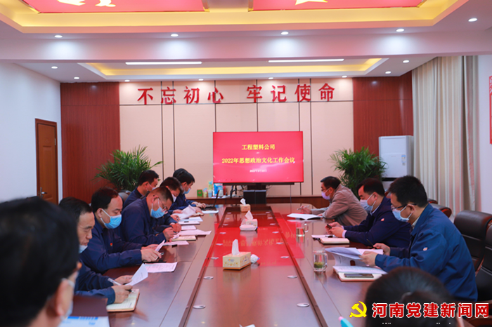 河南党建网讯(李万全通讯员林思雨)3月15日上午,平煤神马集团工程塑料公司在三楼会议室召开2022年思想政治文化工作会议,公司党委书记、执行董事郭选政,党委副书记、纪委书记、工会主席王若群,副总经理刘文生出席会议,相关处室负责人、各基层党支部书记参加会议。