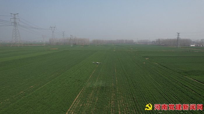 河南党建网讯:3月14日上午,在宝丰县周庄镇刘湾村北的连片麦田中,在工作人员的操作下,两架大型无人机在轰鸣声中腾空而起,灵活自如地在麦田上方飞行、盘旋,均匀喷洒肥料。
