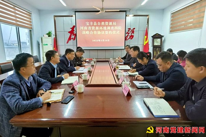 河南党建网讯(李万全通讯员周军伟)3月16日下午,宝丰县自然资源局与河南省资源环境调查四院成功签订战略合作协议。平顶山市自然资源和规划局党组成员、副局长郑世杰主持签约仪式。河南省资源环境调查四院党委书记白领国,副院长杨予生、总工程师杨持恒及宝丰县自然资源局负责同志参加仪式。