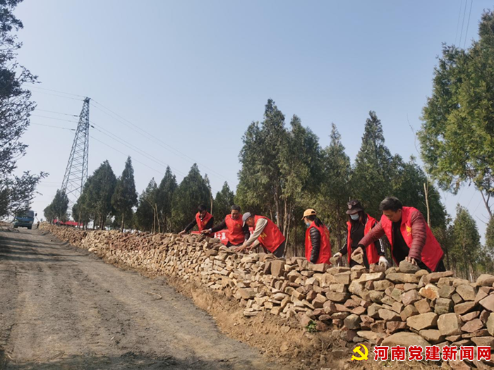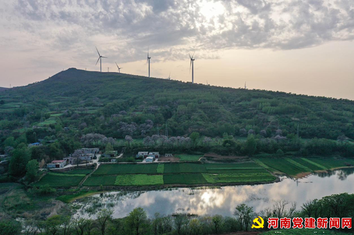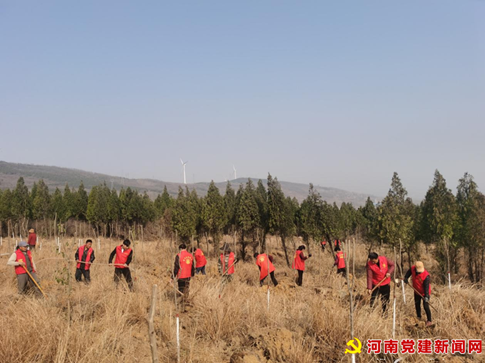 河南党建网讯(李万全 通讯员 张焱 张佳佳)早春三月,乍暖还寒。3月24日走近李庄乡姬家村,高大的风力发电机在慢慢的转着它的扇叶,“大风车”下,随处可见党员群众、志愿者们植树浇水,5000棵大叶女贞树苗“一跃而起”,迎风生长。草木林间,羊群悠然漫步吃着三叶草。放眼望去,绿树、蓝天、青山相互映衬,造就一幅早春添绿图。