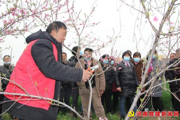 “老师,俺上手试试您看看吧,修剪桃枝是要溜住根儿吗?”“田间课堂”里,“老学员”柳海滨边咨询边上手试剪。